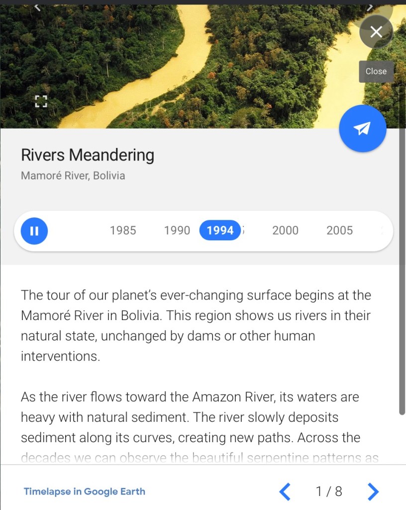 Google Earthโs amazing โTime Lapseโ feature helps children understand the changes of our planet over time and its natural beauty . There are now satellite views of the landscape from 1984 until today and Google has created Guided Tours of parts of the world. Some of the changes are man-made and great for helping students understand urban vs rural.