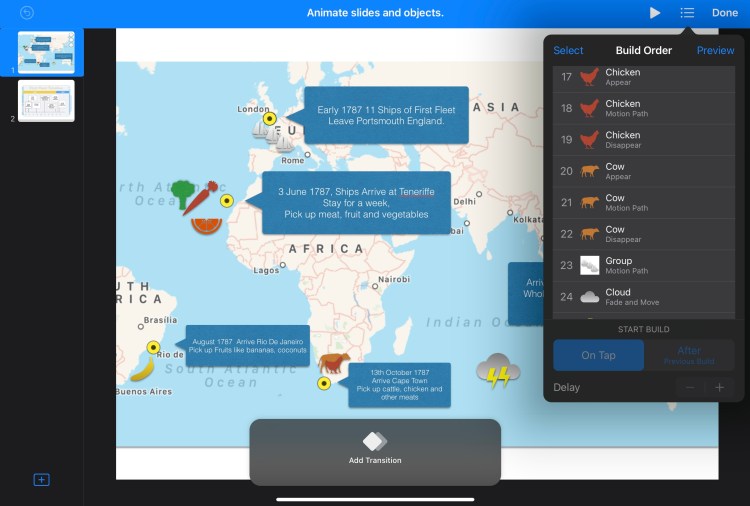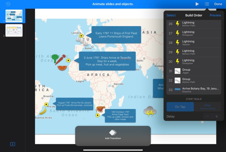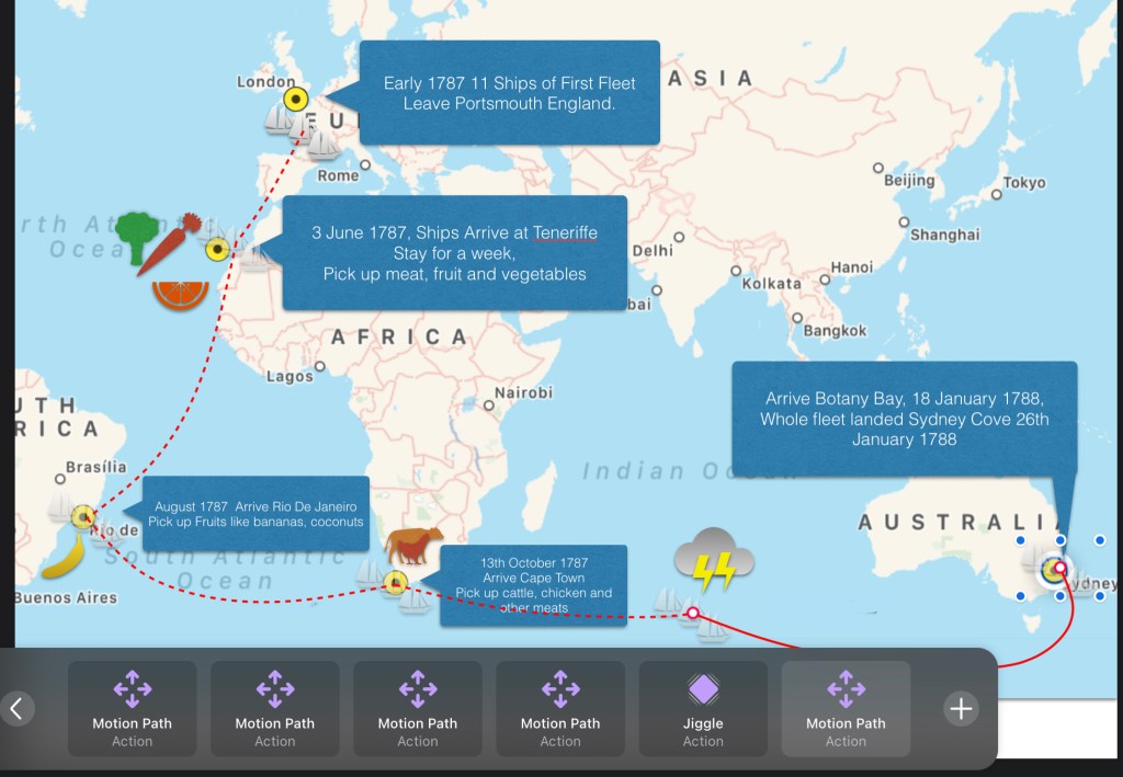 Most of the kids were familiar with these elements which was great, so we moved onto the components around animation which was new. Most people start with animating text, but we wanted to move items around. We demonstrated animating the items using the Motion path, which is a great way to show the path of the journey. In the end the students recorded a series of steps – with shapes being added of the fruits, vegetables, animals and storms the fleet experienced along the way. All of this ended up being a single slide within Keynote, and a sequence of animations and shapes sharing the steps.