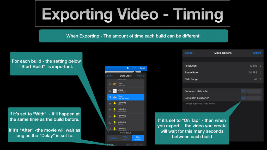 We had to spend a little time explaining how timings work in Keynote -including making this quick guide: When exporting from Keynote there are different behaviours depending on how they have setup their animation timings:
