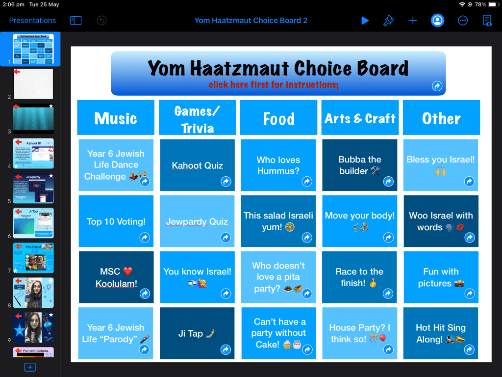 Earlier in the year Mount Sinai College ran the Apple Teacher course and our team was looking at ways to integrate and utilise the skills we learned in order to enhance their distance learning experiences. We decided to create a Choice Board using Keynote linking slides to integrated Clips and Screen Recordings featuring some Snapchat filters (hey they’re kids!).
