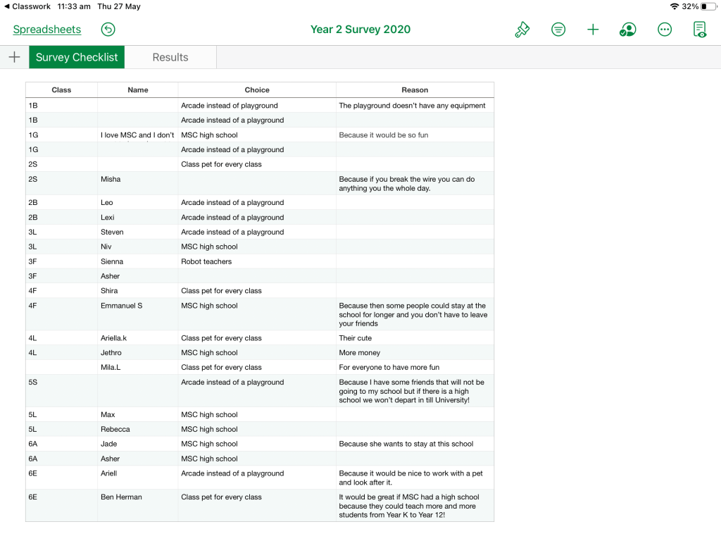 A collaborative document for the whole of Grade 2 to record their survey data.